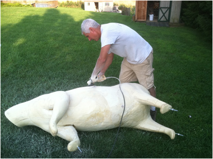 Problem…..the largest black bear form is for a 500 lb bear.  I had mounted my last big bear standing, so I wanted to do something different with this one.  I had all the measurements I needed, and ordered the big form, knowing it wouldn’t be close to what I needed.  I cut the form into 8 pieces, added a jaw set, and started my alterations.  Lenghten by 6”, widen by 4-1/2”.  Build the shoulders, neck, legs and belly with liquid foam.  Take it outside, grind and rasp it.  Bring it in, fit the skin.  Doing this over and over and over until I was satisfied and it fit properly.  With the hide now fitting the form, it was time to begin sewing.