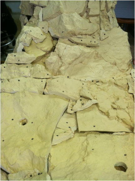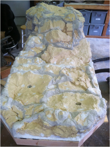 Now I needed to make a base.  I built a frame with 2 x 4’s and ¾” plywood.  Platforms for the legs which were all at different heights had to be added.  I then pieced artificial rock together with over 70 pieces.  I filled the seams with a spackle and fiberglass mix.  Once dry, I painted  the rock and added the habitat.