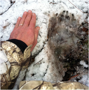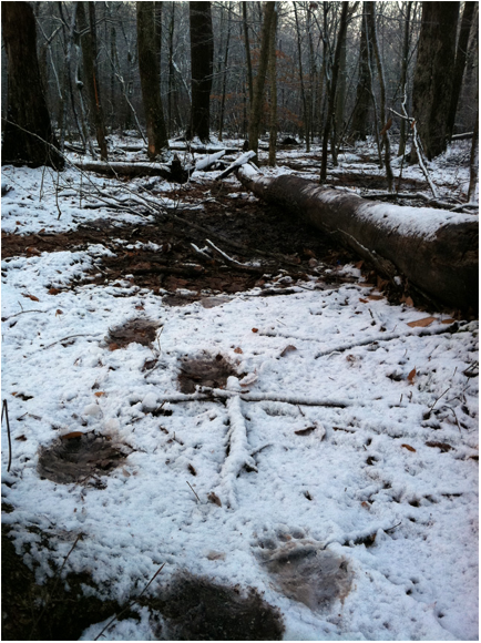 At some point late Wednesday night, the rain changed to snow.  Thursday morning, there was approximately 2” of fresh snow on the ground.  As I approached my spot, I crossed the tracks of the huge bear.  I followed them right to my bait pile.  The pile was empty.  I figured the bear had a fully belly, and wouldn’t be returning soon, so I rebaited and decided to track the bear.  I took pictures of the tracks in the snow and my empty bait pile.